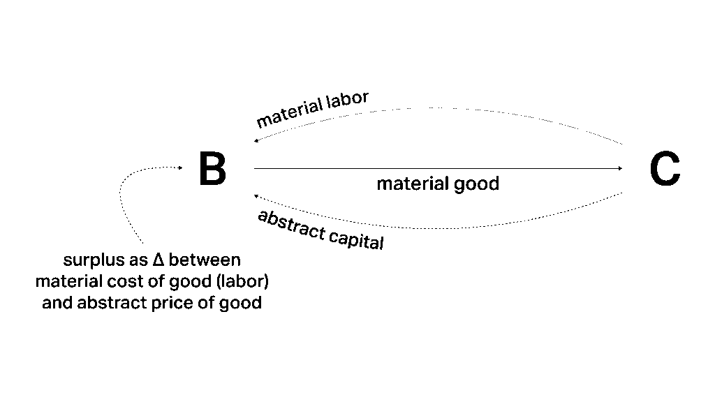 Questo ci porta a chiederci se la condizione del capitalismo sia davvero arbitraria. Ci concediamo il lusso di definire il capitalismo in modo un po’ diverso rispetto alla maggior parte delle persone: invece di concentrarci esclusivamente sui mercati delle merci, sull’estrazione di plusvalore su scala industriale o sullo sfruttamento del lavoro (tutte manifestazioni o attualizzazioni di ciò che chiamiamo capitalismo), puntiamo lo sguardo sull’automatismo attraverso cui si genera più capitale a partire dal capitale stesso, ossia l’equazione marxiana D → D’ (denaro che genera più denaro) come elemento chiave.